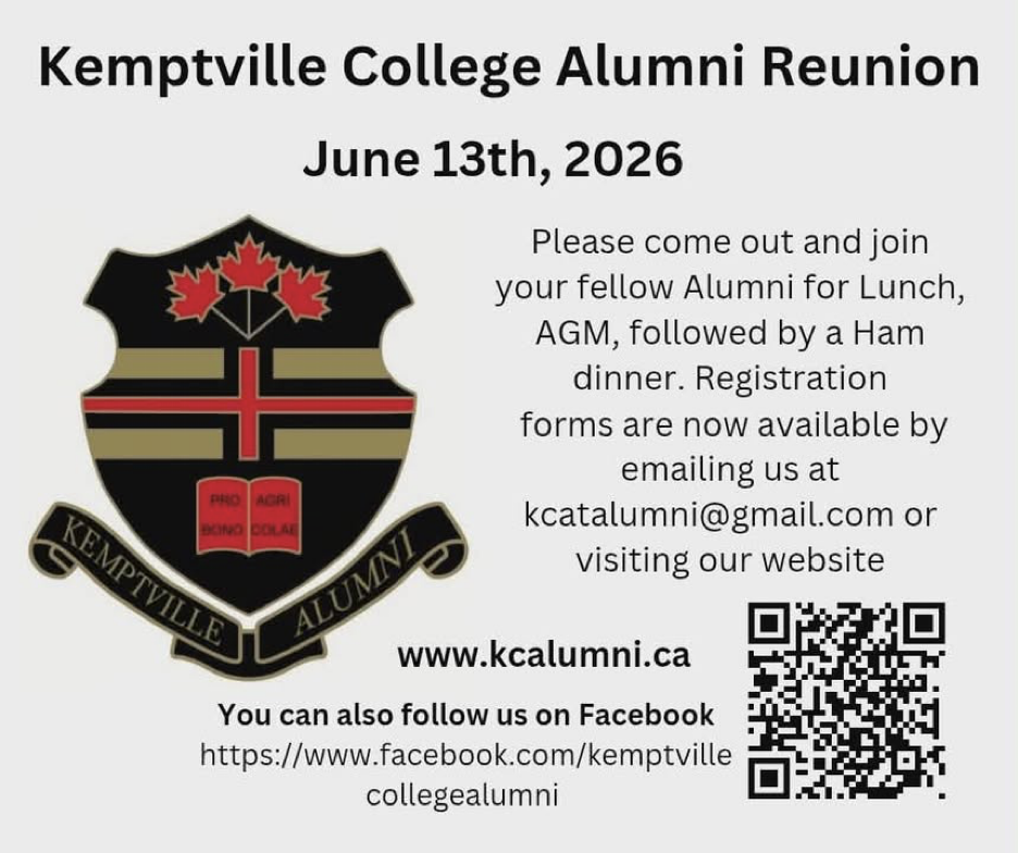 Did you attend Kemptville college or do you know someone who did? If so, you may be interested in their reunion on June 13th, 2026. The organizers are trying to find grads from 2000-2016. Details about the reunion and the registration for can be found at https://kcalumni.ca/reunion/. Please share this information with anyone who may be an alumnus or know someone who is.